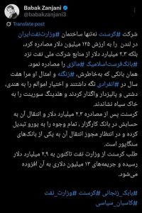 بابک زنجانی در توییتی جنجالی ادعا کرده است شرکت «کرسنت» نه فقط ساختمان وزارت نفت ایران در لندن را به ارزش ۱۲۵ میلیون دلار مصادره کرده، بلکه مبالغ میلیاردی از منابع شرکت ملی نفت را نیز توقیف کرده است.